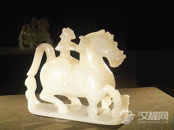 1966年陕西咸阳汉代遗址出土的玉天马,玉质晶莹,造型奇特,骑马者为高鼻、尖额,肩臂生翼的羽人,左手按住马领,右手执灵草,玉马张舌露齿,双目注视,四腿健壮有力,呈向前奔腾状,既有“天马行空”的构思,又有威武雄壮的气势,雕功庄重简洁,玲珑剔透,可为两汉玉雕精品。