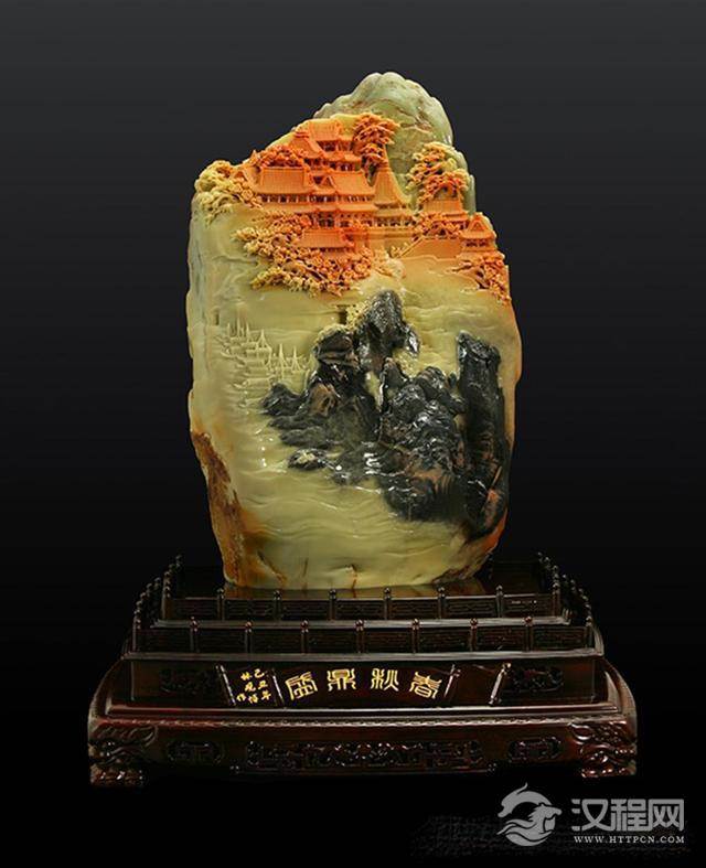 作品简介:该作品于2009年完成,同年荣获第五届中国名石雕刻艺术展金奖。作品采用青田名石封门三彩,以高远式构图,精心雕刻出古色古香的楼阁,雄浑苍劲的峭崖,渺茫掩映的江水,或近或远,或虚或实,因色布局,相互映衬,青黄红黑之间,咫尺千里,具有“春山秋水、博大精深、叹为观止”的视觉效果。
