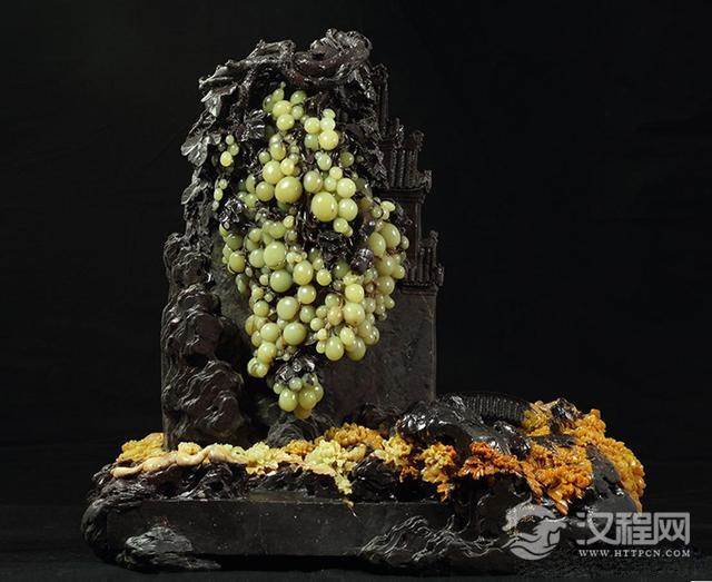 作品简介:秋风起兮云飞扬,累累硕果醉人怀。这件以《醉秋》,为题的青田石雕妙品。材质为青田名贵石种葡萄冻石,此石产自浙江青田海拔高达千米的周山村山老坑,与龙蛋奇石同出一山,颗颗青冻夹生于紫褐色石中,形如葡萄,甚为稀少。作者林观博大师为青田石雕界当代最具创作实力的石雕艺术家之一。作品创作手法以青田石雕传统入手,因材施艺、以色取俏,以镂雕、圆雕为主,辅以写意技法,匠心独运将无言之石,化为一串串、一颗颗饱满,晶莹剔透,令人垂涎三尺的葡萄,透发着满园香气,谁不心醉?花果园中,一朵朵迎霜而发的菊花,形态各异、千姿百态,很好地表现了菊花的风貌气质。 作品造型处理别具一格,突破传统的布局,成倒“T”型院落,衬托景物布置于花园边缘,中心点上,以特写形式把将葡萄冻石精华淋漓尽致地表现出来,突破主题,新意顿出,不愧为大家手笔。