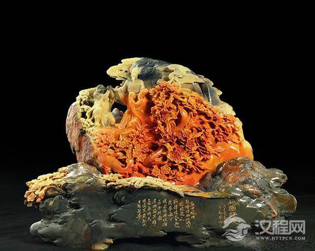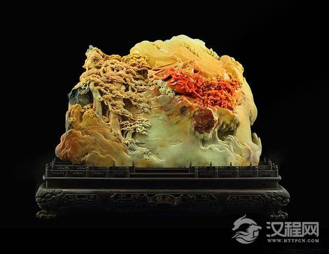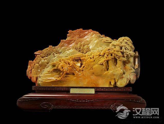 作品简介:这件《江山如画》是青田石雕中的经典名作。作者对山水情有独钟,故而作品见性见情,非同凡响。作品的材质为三彩石,出自青田千年封门老坑,此石红、黑、黄三色相生与一石之中,色彩分明,质地温润细腻,凑刀脆爽,是雕刻石中之极品,甚为难得。 作者运用国画中的“三远法”巧妙构思,谋篇布局独具匠心,将依势造型,因色施艺的技巧运用得恰到好处。并以精湛的镂雕,结合高、浅浮雕和线刻等雕刻技艺,使作品具有山高水远的大境界,又有花草树木、亭台楼阁的精细秀丽。
