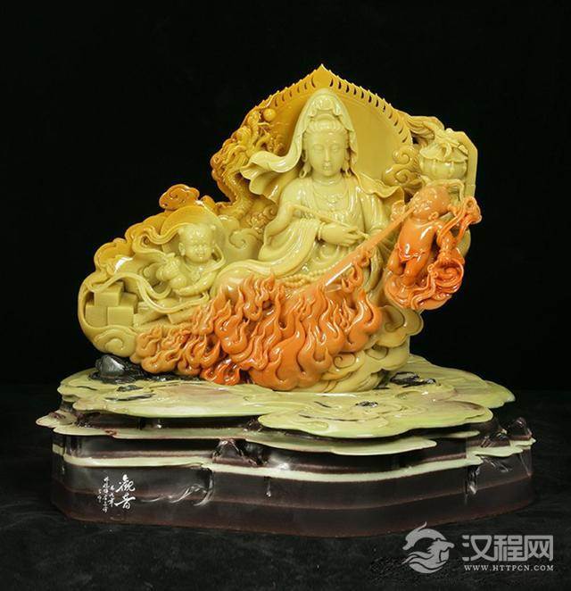 作品简介:作品选用封门三彩石为材质,此石质地极为细腻,如美女之肌肤,甚为难得。作品中的观音慈悲善良、温和怜悯,有着宽广的爱心。金童玉女,活泼可爱。还有俏色的红色火焰,具有驱魔镇邪之效,给人一种温暖的情怀。观音赐福,普度众生,使人们脱离苦海,登上彼岸。更希望人们参天地之化育,明明德于天下。