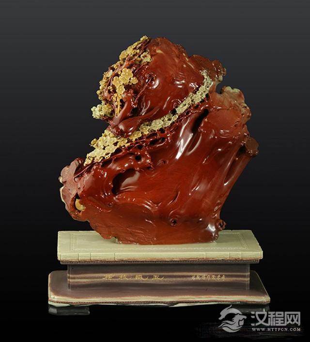 作品简介:《横枝缀玉》于2005年创作,曾获青田石雕评比一等奖,现收藏于青田石雕博物馆。作品以封门状元红为原料,以梅花为题材。原料珍稀名贵,质地细腻,色调曲雅,光泽亮丽,这是封门状元红的最大特征。梅花的题材素来为历代文人题咏的对象,作者为梅,则因材施艺,依色取巧,不但赋以春意,更赋以新意。虬劲的古桩,白玉般的梅朵以及报春的喜鹊,一白一红,一静一动,一疏一密,于雕刻的细化和变化中,飘逸出古梅新韵。