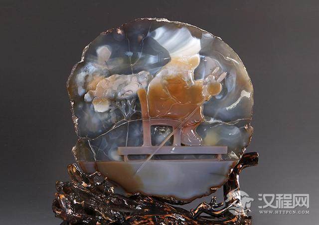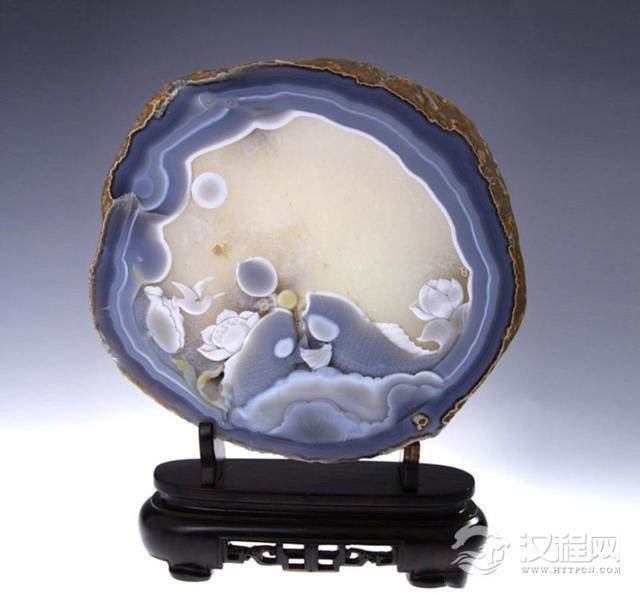 作品简介:池畔蛙鸣奏乐欢,塘莲舒展香满天;晓雾云海仙姑舞,月影婆娑看八仙。一首藏头诗已将作品的内涵表现得淋漓尽致,天然弯曲的白色纹理勾勒出两条鲤鱼的外形,灰白玛瑙料中少见的金黄色做一宝珠,而形成作品的“眼”;浓淡相宜的荷叶衬托出花蕾,给人以清新气息;展翅的翠鸟令画面生动;一轮明月空中高悬,又似映在水面泛起涟漪波光粼粼,艺术的创作理念与大自然的美形成绝妙的和谐。给予欣赏者无限遐想。