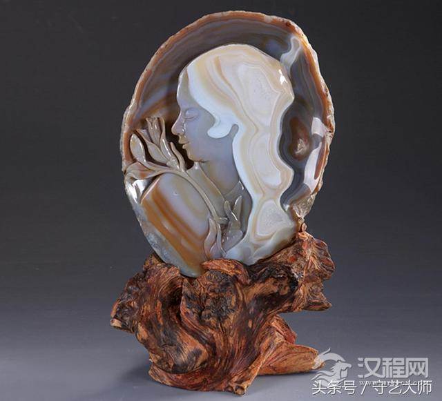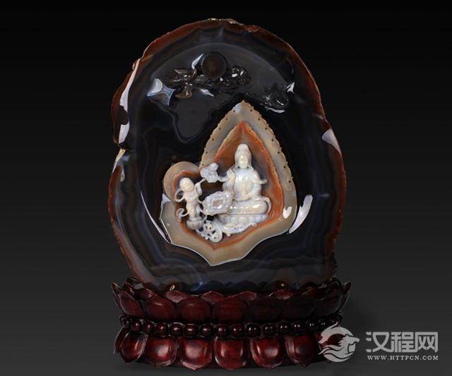 作品简介:大自然神奇的造化孕育了玛瑙丰富的色彩和奇特的纹理变化,大师“俏形艺术”的创意将这美感巧妙设计,用似白玉般的白色雕刻出观音菩萨,丰满的面容绽溢微笑备感慈祥,轻柔的服饰在祥云的衬托下更显飘逸,展现了观音菩萨普渡众生、福降人间的慈悲之怀;周围未经雕琢的纹理线似闪烁的佛光,形成天人合一的神韵境界。