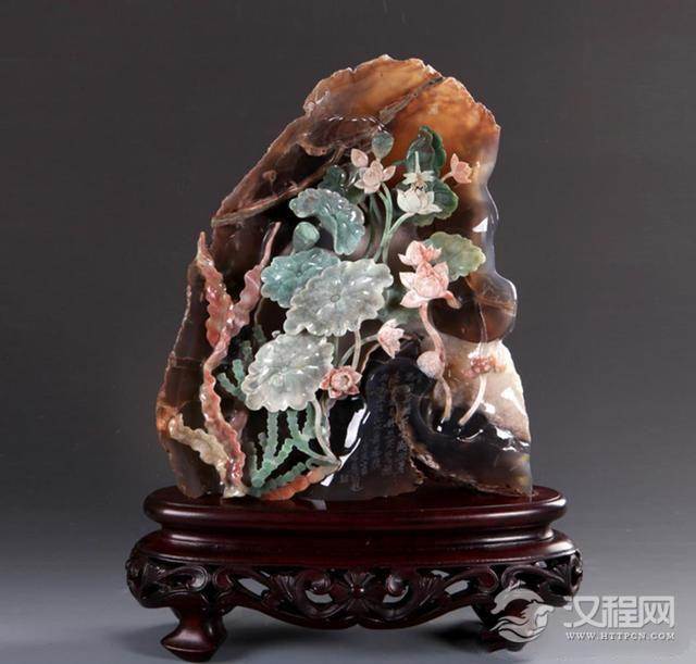 作品简介:莲蕾争绽艳满塘,池鲤泛漪映月光;清雅凌风古今秀,韵丰墨彩叹难妆。绿和粉红色在玛瑙原料中可谓罕见,本作品中的绿色竟有五个色调,更有粉红色块相伴使其倍加珍贵,将其巧妙设计成姿态各异的莲叶,朵朵的莲花绽放清香,花蕾、莲蓬随风摇曳,天然杂乱无章的颜色被合理构图,精雕细刻使之形成难得的艺术精品。