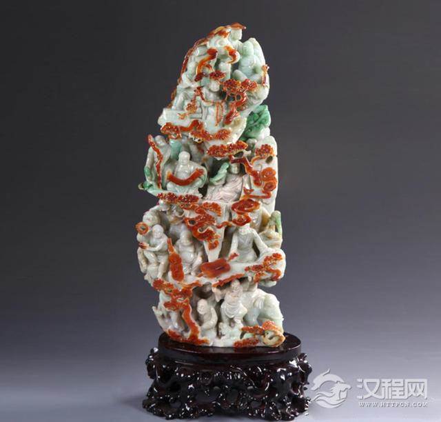 作品简介:乾仕义薄云天翔,坤颂康熙盛世章;正应时来扶社稷,气宇仁德誉四方。该作品取材于广传民间的十八罗汉典故,选用天然的翡翠原料,经过反复推敲,将十八个人物分为四组,人物、动物、植物、山石重叠,错落有致,疏密合理,既突出人物的主题,又不失“山子”处理手法的壮观稳重。看似浮雕,实为深雕和圆雕,注重把俏色的点、线、面特征尽可能表现出来,使之巧的自然、俏的合理,形成似天然铸就恰倒好处。