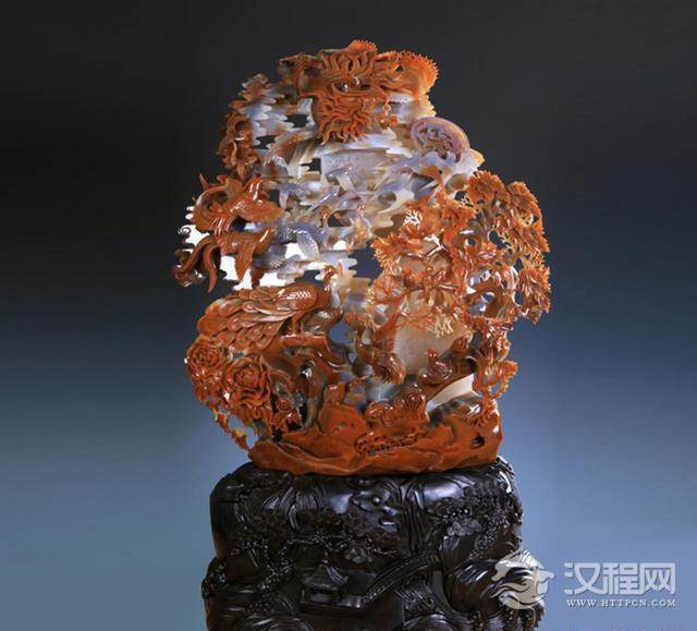 作品简介:万众同心颂党辉,物阜民丰壮国威,向荣和谐勤政举,阳光祥瑞华龙飞。选用优等充满吉祥喜庆的天然橘红色玛瑙料,整体大胆的采用满满的构图,看画稿就有“拥挤”的感觉;把中间部位深挖露出白色,将大、中、小三种鸟放在远中近三个层面增强视觉效果,亮丽的橘红色分布四周构成全面亮丽的视觉冲击,深度的镂空将130余斤重的原料磨制剩52斤,构图疏密有致、俏色干净醒目、透雕工艺精细。作品命题为《万物向阳》;上方保留最大一个圆形平面喻为太阳,象征着中国共产党,在太阳的照耀下梧桐茂盛,百花绽放,一片欣欣向荣繁荣景象,雕刻有凤凰、孔雀、仙鹤、锦鸡等十三种栩栩如生的群鸟围绕太阳飞翔,洋溢和谐,表达着十三亿中国人民万众一心跟党走的决心。背面为祥云山川,象征着祖国的大好河山,基业永固。