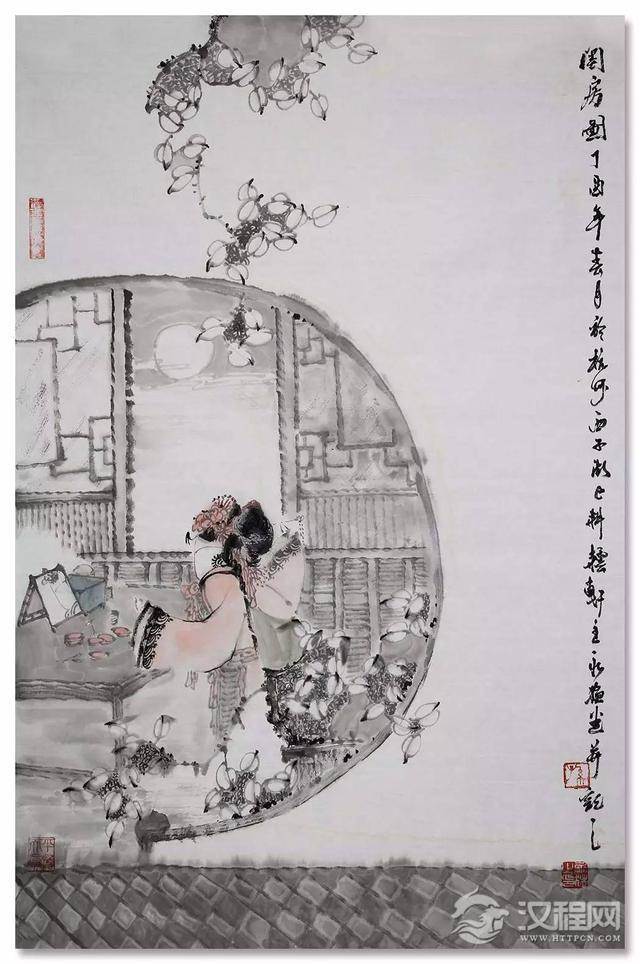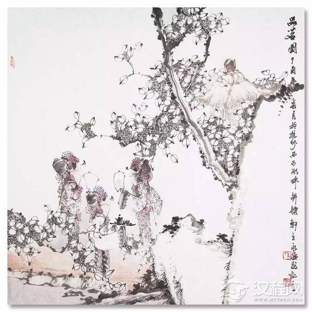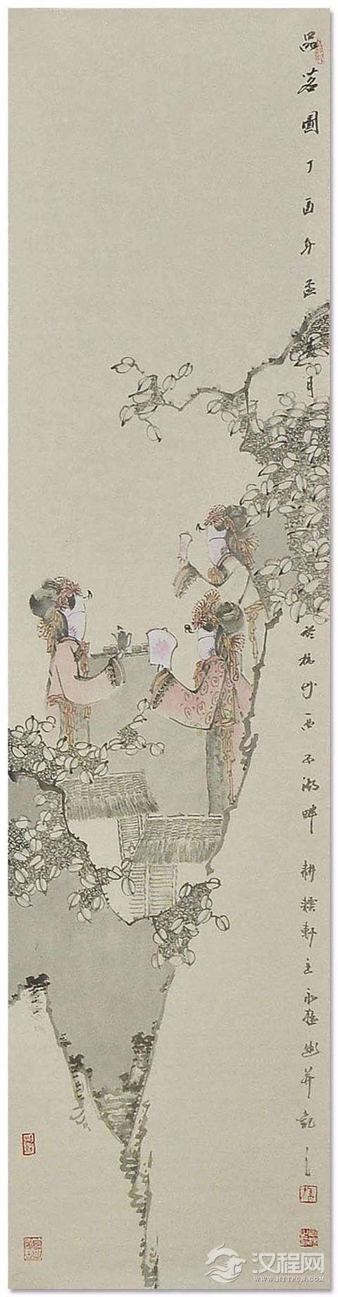 作品造型不拘一格,将女子们的形态细致入微的呈现在观赏者面前,有较强的艺术感染力,展现出美妙的意境。其简洁的构图与对环境的描写烘托人物性格,渲染人物动态,进而突出画面主体。画面极具空间感,层次清晰,人物形象生动,雅俗共赏。