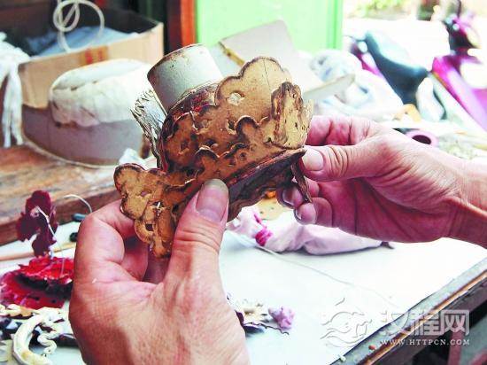 制作神像木偶头戴的主要材料为铁丝、牛皮胶、铁漆、胶片、金箔、缎布、绒球等近20样,其中还不包括一些细部的琐碎零件。而各式各样的制作工具,更是涵盖了诸如模具、蜡版、电烙铁等。材料多,制作过程更是马虎不得。粗算之下,陈师傅所介绍的工序有八道之多,分为打模型、帽筒成型、搓铁丝、刺图样、铁线黏合纸板、胶底粉线、涂漆底、安装。其中胶底粉线工艺是比较重要的。据陈师傅介绍,在毛坯和纸样加工好的基础上,还需上浓胶水,为上粉线打底,然后再用牛皮胶或明胶用特制容器煮成黏稠状,掺和已筛细的石粉,经研磨调和后,装在粉筒中,安装上自制的粉线头使用。