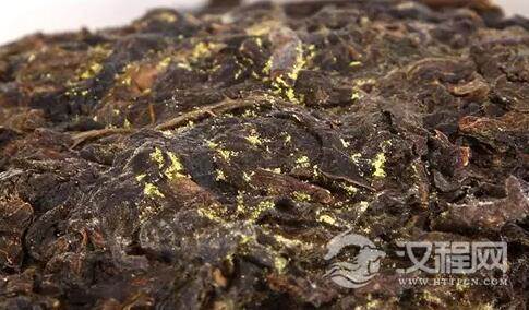 黄曲霉外观也呈黄色片状分布,在人为的作用下,也可以造成“金花”的样子,常人难以分辨。最好的办法就是从外形来看,霉菌是丝状成片分布,呈黄色,通常分布在饼面一角,霉菌在14天至21天时面积就可达4cm至6cm,高约0.5cm~1cm,茶体本身霉变发黏,叶间界面不清楚,茶色深黑。霉变过又干燥存储的茶,霉菌体干缩,形状不规则,且色呈褐色。