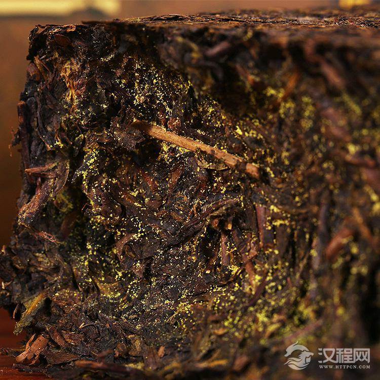 不同年代茯砖茶的“金花”色泽是不断变化的:刚出烘的新茯砖茶,砖身内生长大量的金黄色颗粒,形似“米兰”。随着陈放年代的延长,金花逐渐萎缩变白,有些年代久远的茯砖茶已看不到金花,只是隐约可见白色的斑点。因此,新茶“金花”茂盛而有些老茶“金花”较少甚至看不到。