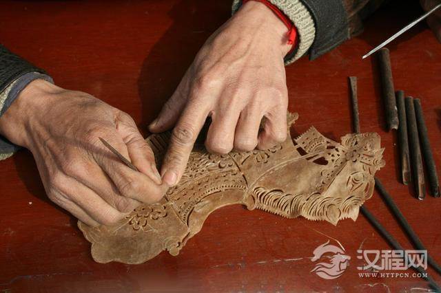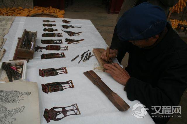 周至皮影雕刻是在泡制好的牛皮上画好图案后,用专用刀具雕刻成各种戏剧人物、花鸟鱼虫、飞禽走兽,然后涂上各种色彩,再用牛皮丝组装合成。其雕刻工艺比较复杂,分为选皮、泡皮、刮皮、晾晒、制皮、过稿、雕刻、涂彩、发汗、上漆、组装、合成等十一道工序。每道工序都有严格的要求,比如雕刻工序,用专用刻刀照着过好的图案一刀一刀雕刻,皮走刀不走。雕刻中,要线条均匀、精细、流畅,不能有断点,要阴刻阳刻结合,雕刻人物要按照皮影五分脸原则,先刻外围,再刻里面,先刻脸,再刻头帽。主要制作工具有斜口刀、平口刀、圆刀、三角刀、花口刀等。