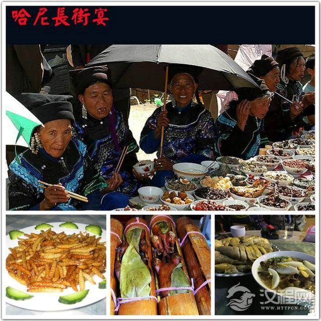 饮食文化:哈尼族是我国古老的山地民族,主要聚居于云南西南部,以农业为主,善于辟梯田种稻谷,掘坡地植茶林,他们培育出著名的“紫米”(接骨米)和“普洱茶”,创造了中国农田史上七种田制之一的“梯田文化”。竹筒煮出来的肉汤或菜汤,味清醇,鲜香,具有独特风味。卵石煮汤,需选择酒杯般大小的光滑卵石(最好是河中的卵石),洗净,投入火塘内加温,将卵石烧红。猪蹄或猪排骨预先煮熟,盛于器皿之内,加上豌豆尖等时鲜小菜及葱花等佐料摆在桌上。待欲开宴进餐时,将烧红的卵石投入盛汤的器皿内,使汤滚沸,将时鲜小菜煮熟。用卵石煮过的汤,特别鲜香,此外,哈尼族每天只吃两顿饭,以大米为主,玉米为辅。哈尼族爱吃糯米粑粑,用芭蕉叶包着与腌肉一起吃。