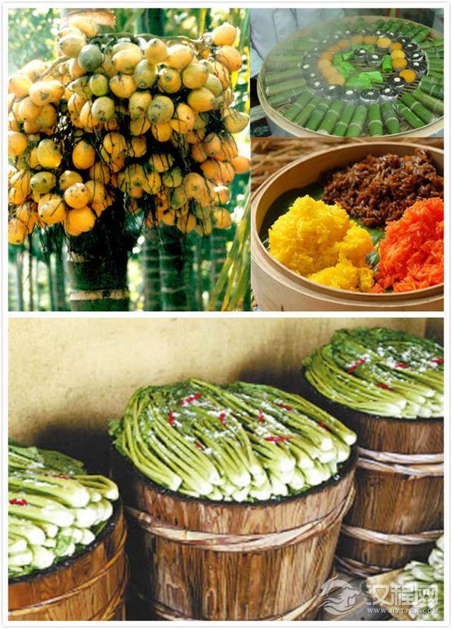 饮食文化:傣族大多有日食两餐的习惯,以大米和糯米为食。1.德宏的傣族主食粳米,西双版纳的傣族则主食糯米出劳动者常在野外用餐,用芭蕉叶或众饭合盛一团糯米饭,随带盐巴、辣子、酸肉、烧鸡、喃咪(傣语,意为酱)、青苔松即可进食。 苦瓜是产量最高、食用最多的日常蔬菜。除苦瓜外,西双版纳还有一种苦笋,因此傣族风味中还有一种苦的风味,较有代表性的苦味菜肴是用牛胆汁等配料烹制的牛撒皮凉菜拼盘。,2,宗教食俗 傣族普遍信仰南传上座部佛教,不少节日与佛教活动有关。浴佛节(泼水节)期间,除酒、菜要丰盛外,各种傣族风味小吃也很多。还有把糯米饭泥炸后做成的麻脆等。