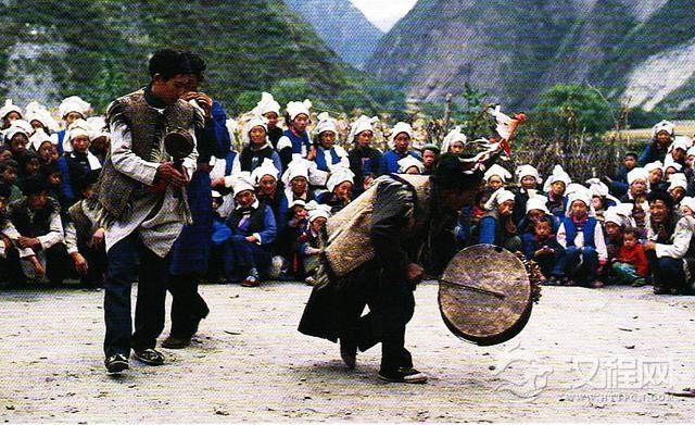 传统鼓舞源于祭祀舞蹈,又称“跳经”。旧时羌族巫师“释比”作法时手持羊皮鼓而舞,动作激烈、敏捷有力,造就出与魔鬼拼搏的紧张气氛。