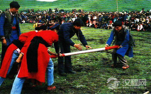 长约一丈手臂粗细的木杆,一人紧握一端并骑在两腿之间防守,另一人则握着木杆的另一端用力向前推进攻。进攻方将木杆向前推至两尺外的界线处算获胜。比赛时围观者吶喊助阵,比赛显得紧张热烈。这种运动体现了羌人尚武好胜的传统。