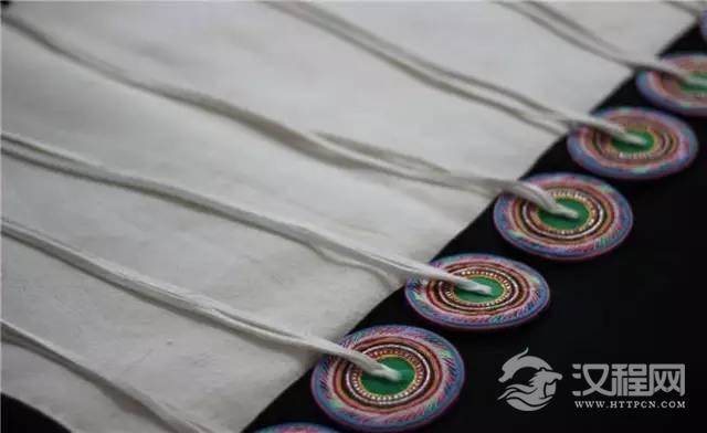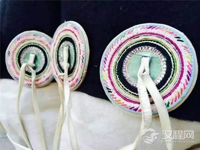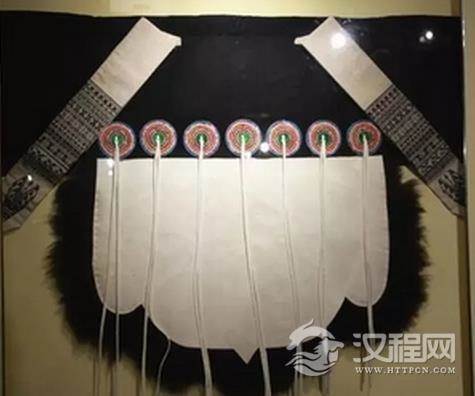 羊皮披肩是最具特点的,披肩上并排钉着七个直径为二寸左右的绣花圆布圈,每圈中有一对垂穗。