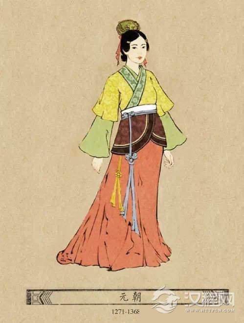 元朝汉族妇女仍保持宋代的服制,上衣有比较瘦俏的背子,衫襦,云肩等,下穿多褶裙,头上一般梳顶心簪。后来受蒙古族妇女服饰的影响,穿一种黑褐色粗布或绢做的左衽、窄袖、腰束大带的长袍的人渐渐多起来。另外,这一时期在妇女中还流行各种单,夹棉的对襟衣和半袖袄,这是与唐宋时期的服饰不相同的,而蒙古族妇女的服饰就带有她们本民族的特点了。
