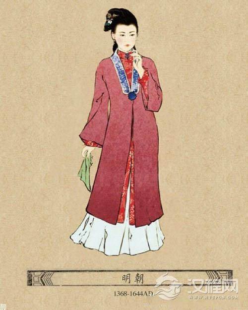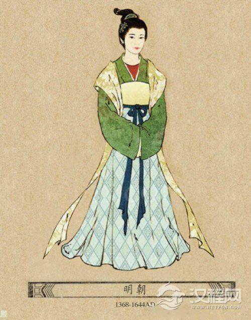 明朝为重新振兴中国社会,明朝政府采取了上承周汉,下取唐宋的治国方针,对整顿和恢复礼仪极其重视,并根据汉族传统重新规定了服饰制度。明代的女装已与前代不同,但在明初还能看到舍人和元代的影响。左衽、窄袖长袍仍可见到。一般女子时兴窄袖的衫襦、背子、长裙等。