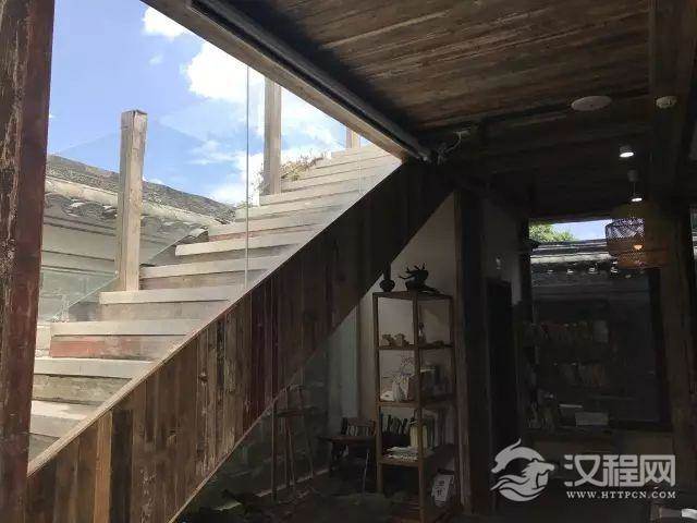 走过“一箪”,有个“天梯”在蓝天的映衬下特美,透明的玻璃隔着木质楼梯,着实眼前一亮。走到上头是个纳凉的地方。秸秆为材的帘子,显得特别古朴。