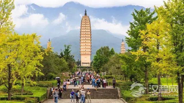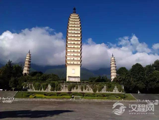 唐代建筑的大理崇圣寺三塔,主塔高近六十米,分十六级,造作精巧,近似西安的小雁塔。