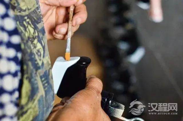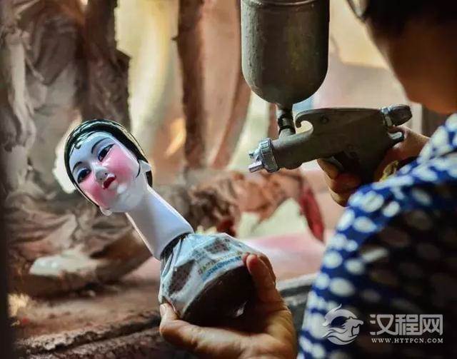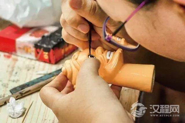 用各种颜料为木偶头着色,这一工序有时需要重复多次。