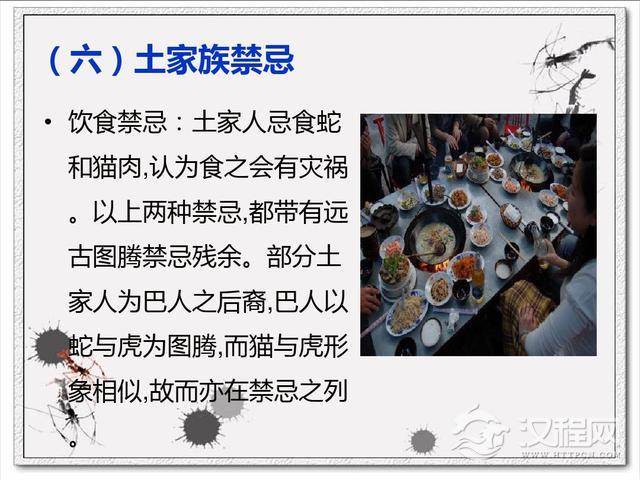 相关介绍。土家族日常主食除米饭外,以包谷饭最为常见,包谷饭是以包谷面为主,适量地掺一些大米用鼎罐煮,或用木甑蒸而成。有时也吃豆饭,即将绿豆、豌豆等与大米合煮成饭食用,粑粑和团馓也是土家族季节性的主食,过去红苕在许多地区一直被当成主食,现仍是一些地区入冬后的常备食品。土家族菜肴以酸辣为其主要特点。民间家家都有酸菜缸,用以腌泡酸菜,几乎餐餐不离酸菜一种菜肴,也是每餐不离的调味品。如插秧季节,早晨要加一顿“过早”,“过早早”大都是糯米做的汤圆或绿豆粉一类的小吃。据说“过早”吃汤圆有五谷丰登、吉祥如意之意。土家族还喜食油茶汤。油茶汤是恩施土家族特有的一种传统美食,很受当地人的喜爱,其中以湖北省恩施土家族苗族自治州下属来凤县的油茶汤最为著名。当地有话曰:家无油茶汤,顿顿都不香。包谷是旱地一年生草本植物,性暖,吃包谷饭,的好处是暖胃,还有就是因为它比较细不伤胃,常吃不易得胃病。同时说到土家族基本上都会很快联想到土家腊肉。不得不说腊肉一直是土家族的头等大菜,每年冬至过后,勤劳聪明的土家族人就会将大块的猪肉用盐、花椒、五香粉腌制好,吊挂在火炕上,下烧柏树枝田,烟熏而成。这样做好的腊肉的防腐能力强,能延长保存时间,并增添特有的风味,这是与咸肉的主要区别。熏好的腊肉,表里一致,煮熟切成片,透明发亮,色泽鲜艳,黄里透红,吃起来味道醇香,肥不腻口,瘦不塞牙,不仅风味独特,而且具有开胃、去寒、消食等功能。特别是湖北土家腊肉保持了色、香、味、形俱佳的特点。素有“一家煮肉百家香”的赞语。土家族人热情好客,招待客人更是有自己特殊的方式。他们待客喜用盖碗肉,即以一片特大的肥膘肉盖住碗口,下面装有精肉和排骨。为表示对客人尊敬和真诚,待客的肉要切成大片,酒要用大碗来装
