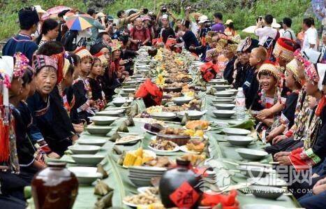 瑶族人民的热情好客,与汉族地区比较,有过之而无不及。凡是进入瑶家的客人,都会受到尊重和热情款待。饶有风趣的“挂袋子”与“瓜箪酒”,是瑶家待客的典型礼节。客人到了瑶家,只要把随身携带的袋子往堂屋正柱上的挂钩上一挂,就表示要在这家用餐。不用事先说明,主人自然会留客人在家里就餐。如果不懂这个规矩,老把袋子等物放在身边,主人就认为你还要到别处去,吃饭的事往往落空。 瑶族对祖先很尊敬,习惯在进餐之前先念祖先几辈姓名,表示祖先先尝后子孙才能受用。尤其对丰盛的餐食更是如此。每逢节日必备猪肉、鸡、鸭和酒等祭拜祖先,吃饭座次也有讲究:老人和尊贵的客人须坐上座。遇有客人,要以酒肉热情款待,有些地方要把鸡冠献给客人。瑶族在向客人敬酒时,一般都由少女举杯齐眉,以表示对客人的尊敬;也有的以德高望重的老人为客人敬酒,被视为大礼。 瑶家待客慷慨大方,彬彬有礼。腊肉、山珍野味和土特产,是瑶家待客最常见的菜式。客席上,金黄厚实的腊肉奉为上品,主人会热情地把大块腊肉夹给客人。客人不管喜不喜欢,都应当接受,这样主人才会高兴。 瓜箪酒是瑶家招待客人的特制酒。这种酒用糯米制成。它酿成糊酒后,掺上清泉水或凉开水,饮用时用瓜瓢舀出倒在碗里,连液带渣一起喝下。酒度不高,香甜可口。用餐时,由家里最年轻的姑娘斟酒盛饭,主人则频频向客人夹菜敬酒。此时,客人不必拘束过谦,应大大方方开怀畅饮。这样,主人认为客人看得起瑶家,就会越发高兴,备加亲热。如果拘谨见外,反而不受欢迎。 在达山瑶中,也喜用油茶敬客,遇有客至,都习惯敬三大碗。名为“一碗疏、二碗亲、三碗见真心”。瑶族老人也喜欢饮茶,故茶水也是待客饮料。款待客人时,鸡、肉、盐一排排地放在碗里,无论主客,必须依次夹吃,不得紊乱。客人和老人每吃完一碗饭都由妇女代为装饭。 盐在瑶族食俗中有特殊的地位,瑶区不产盐,但又不能缺少盐。盐在瑶族中是请道公、至亲的大礼,俗叫“盐信”。凡接到“盐信”者,无论有多重要的事都得丢开,按时赴约。