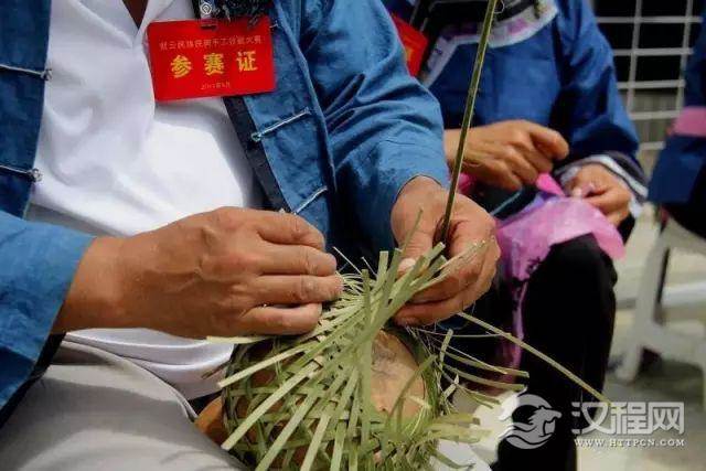 比赛现场,选手们均身着自己民族的服饰,胸前戴着参赛证,意气风发。编织类赛区一隅,50多岁的布依族选手罗洪林正专心致志地编织着一个葫芦套。贴着葫芦的表面,十几根细长的竹片在罗洪林手里经过飞快地按压、收压,不一会儿,半个葫芦已经“穿”上了别具一格的镂空竹“外套”。