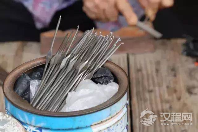 物生其用,一样工具的出现,会附带一门工艺(行业),“工欲善其事,必先利其器”。花针用起来也是很讲究的,用久了会钝,钝了就得锉,于是乎就有了“锉花针”的工艺(行业),随着勾花的人越来越少,这一行业也在慢慢的消失~