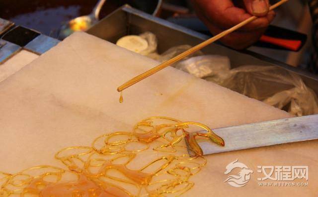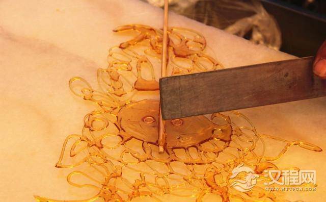 待糖人快干后(完全干容易折断),利用钢尺将糖人与大理石分离,这样我们的糖画就做好了。