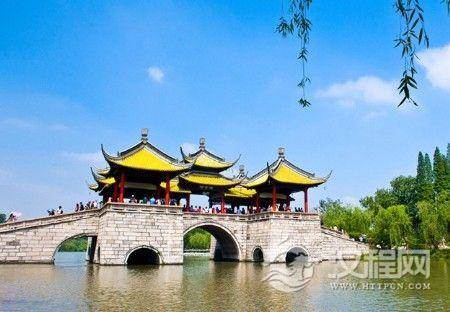 五亭桥:位于江苏内,桥基由12条大青石砌成,桥身为拱圈形。由3种不同的圈洞联合,共有15孔,孔孔相通,桥上置有五亭,而且亭与亭之间又以廊相连。