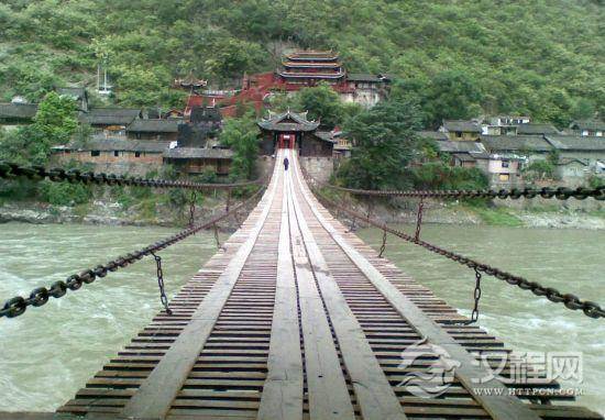 铁索桥:位于四川省的城西上,以9根铁链铺以木板构成,左右两侧各安两根铁链当扶手,铁链粗如碗口,每根长150米左右,重约一吨。