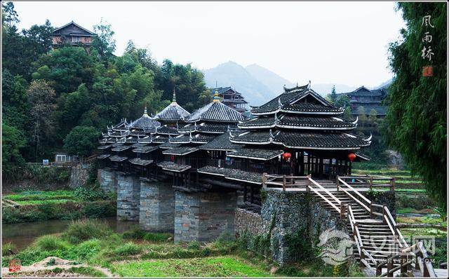 风雨桥:坐落在县的程阳村边的河上,全桥为石墩木面瓦顶结合而成。桥上建有五座宝塔形状的楼亭,可避风雨。整座桥无一铁钉,全用桁槽衔接,它斜穿直套、纵横交错,十分精致牢固。