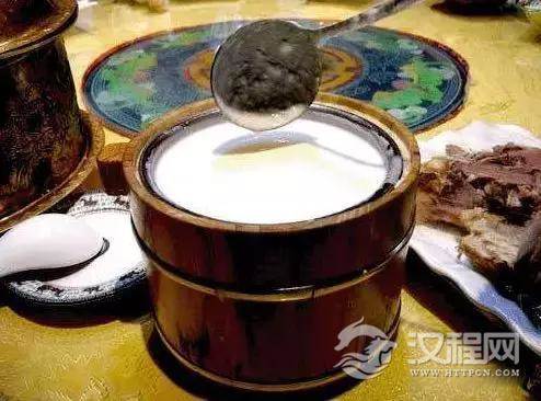 藏族“酥油茶” 其做法:把茶砖切开捣碎,加适量的水煮沸后滤出茶渣,调入食用酥油,茶汁和酥油就混合成乳白色的“酥油茶”。每有宾客来访,全家在帐蓬外恭候,待客人进帐坐定后,女主人即双手缓缓捧上酥油茶敬给来宾,使客人有宾至如归之感。