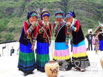 酒在彝族的古老习俗中,是人们表示礼仪诚信、联络感情不可缺少的饮料。在任何一个他们喜欢的场所,几个想好的彝族同胞相聚在一起,便会席地而坐,围成一个圆圈,各自拿出随身携带的酒u,喝“转转酒”。