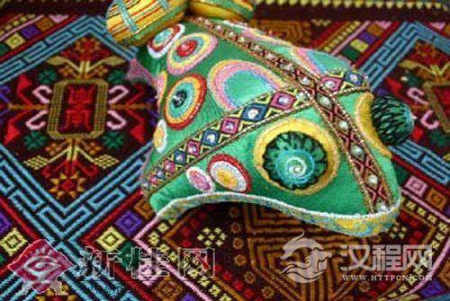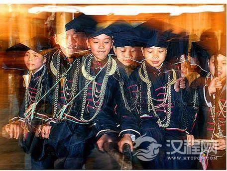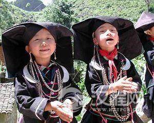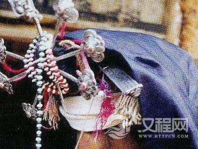 妇女头巾都是一块自己纺织染成的长条黑布,戴时先围绕在头上圈,然后翻折摆布成火棱彤的图样,罩在整个头上,再把头巾的两端分别垂挂到双肩上,看上去朴素美观。同时还可以当做帽子遮荫用。他们的衣边、衣角、袖口、裙边和头巾的四边都用红布或黄布剪成小条以后镶捆上去,有的则用红、黄、蓝色丝线绣成波浪形的线条,使黑中衬出红、黄、蓝色的线条来,清雅明亮,色彩协调。再加上头发插着龙头形的假簪,颈项上带有银链或项圈,手带银圈、玉镯,耳挂珍珠耳环等,使人一看,黑中闪艳。朴素之中亦有玲珑之美,表现了她们独特的审美观。