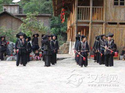 男人穿的是前盖大襟上衣,以宽裤脚、大裤头的裤子相搭配。这种装束便于他们进行劳动和在山里行走,古装的男装,头上还缠着圈成数圈的黑布头巾,腰间系上一条红布或红绸,以示驱鬼赶邪,也兼有威武神勇的气概。