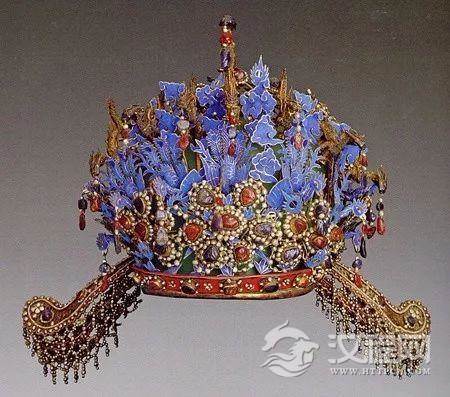 洪武三年定制,皇后在受册、谒庙、朝会时穿礼服,其冠,圆框冒以翡翠,上饰九龙四凤,大、小花树各12,两博鬓、12钿(短头大花的花簪)。