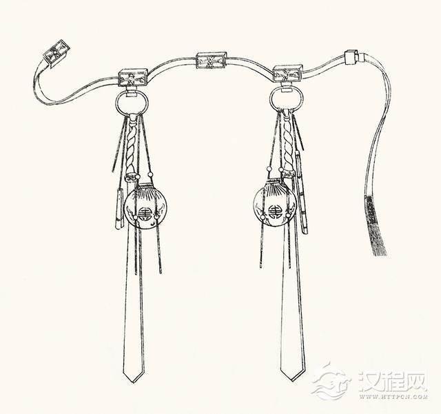 亲王朝带与皇子朝带同式,在腰带上配以4块金质衔玉方版,每版之上饰4颗东珠,版中央另饰1颗猫睛石(俗称猫眼石);腰带及左右佩绦均用金黄颜色;左右带帉为蓝色,下部略宽并形成锐角,配有典型的满洲荷包、解食刀等饰物。由尚可喜画像来看,也大体符合清宫传统定式。