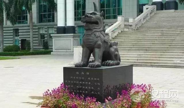到了东汉时期,皋陶像与獬豸图成了衙门中不可缺少的饰品,而獬豸冠则被冠以“法冠”之名,执法官也因此被称为獬豸,这种习尚一直延续下来。至清代,御史和按察使等监察司法官员一律戴獬豸冠,穿绣有“獬豸”图案的补服。不仅在服装,在皇家建筑方面,獬豸的形象也必不可少,如明孝陵和十三陵的镇墓神兽,还有故宫太和殿、乾清宫内威严的独角兽,都是獬豸的化身。直到今天,在我国一些法院门口布置的代表法律的护门神兽也是獬豸。獬豸文化的源远流长可见一斑。
