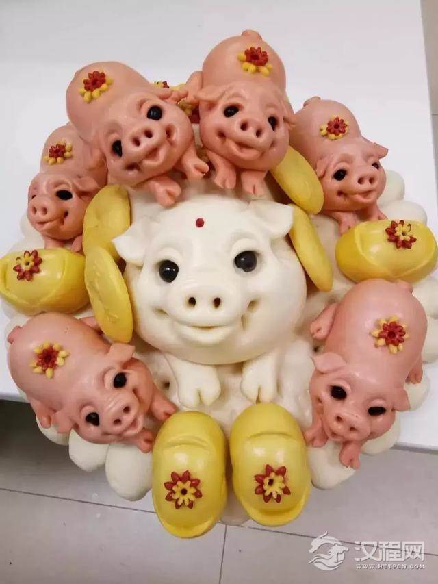 面塑俗称花馍,是一种纯朴的民间纯手工艺术。山西、山东一带,凡是逢年过节,生日满月,婚丧嫁娶,礼尚往来,村村镇镇,家家户户,都要用最佳精粉,按照当地的传统习俗制作种种面塑,表达各自的心愿和祝福。新春佳节,要捏制枣山、枣糕(高)、枣蛾,柏枝、财篮、财神人、羊头、猪头、鸡、鱼、虎、兔、佛手、石榴、柿子等面塑,象征福寿康宁,财源茂盛,万事如意,吉庆有余。侄儿耿根根由于是面点出身,基本功好,上手快,瞧他最近制作的十二生肖香饽饽,多形象、多逼真、多可爱、多见功夫啊!师傅都啧啧称赞,真是“青出于蓝而胜于蓝”。他制作的猪头、羊头、麦秸集、针线笸箩、剪子、坐饽饽(女人坐在莲台上)等面塑,在山东一代叫“羊羔馍”,寓意牛羊满圈,五谷丰登,男耕女职,四季平安。
