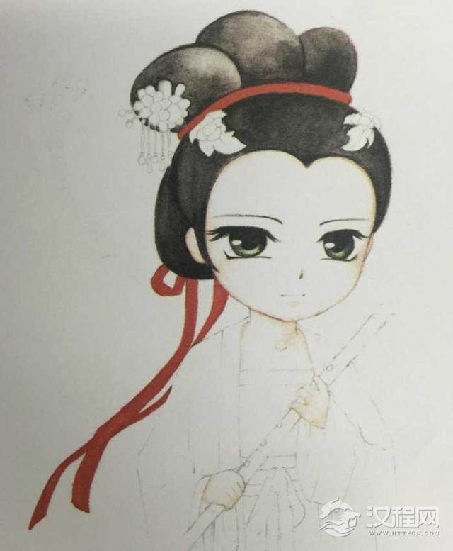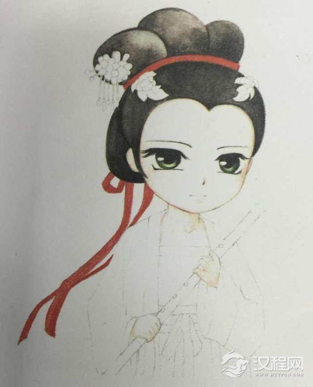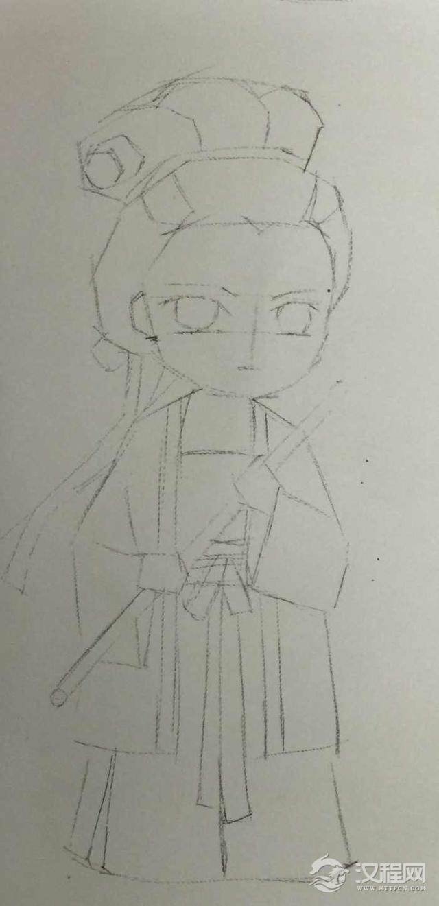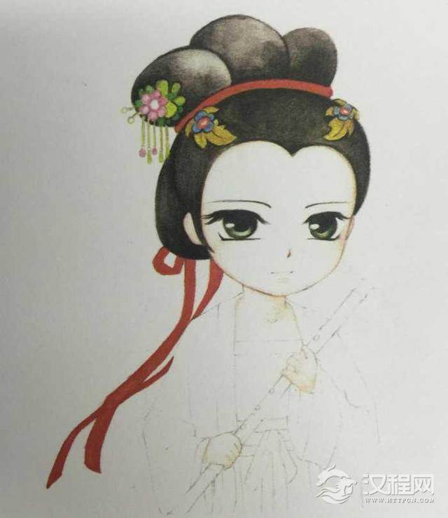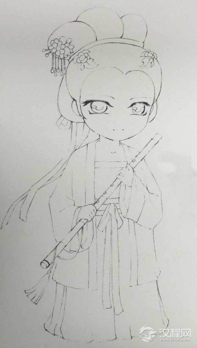 3、细化线稿,仔细画出面部五官、头发上的发饰、服饰上的花纹皱褶等细节,然后橡皮擦去没有用的线条。