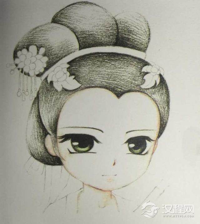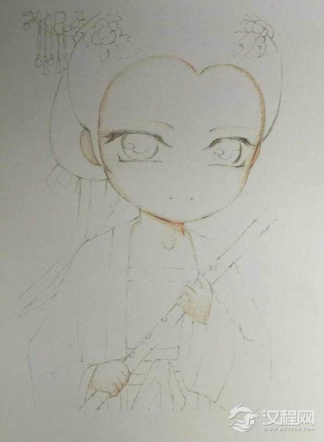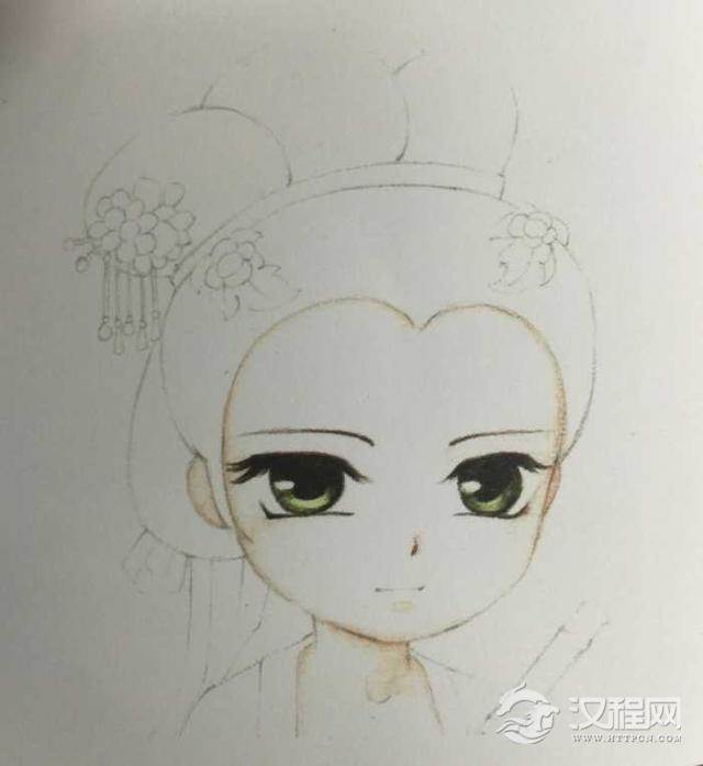 2、在轮廓内勾出五官的大形,再画出头发和服饰的特点。