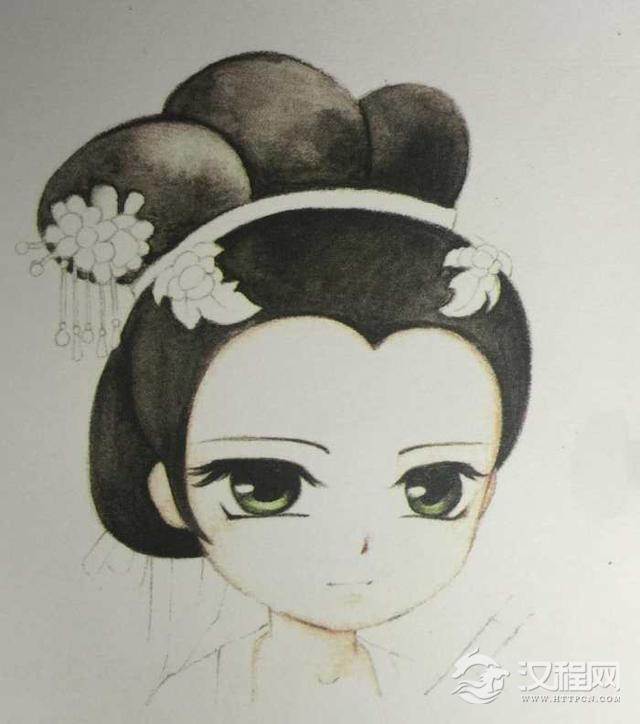 9、刻画三丫髻,用499黑色给头发上色,注意根据头发的发型留出高光的位置。