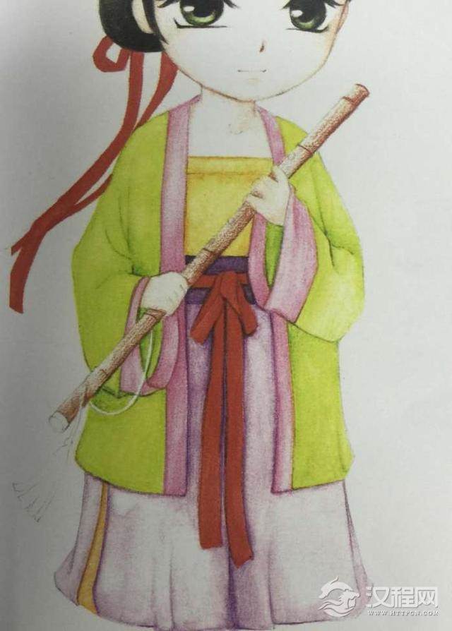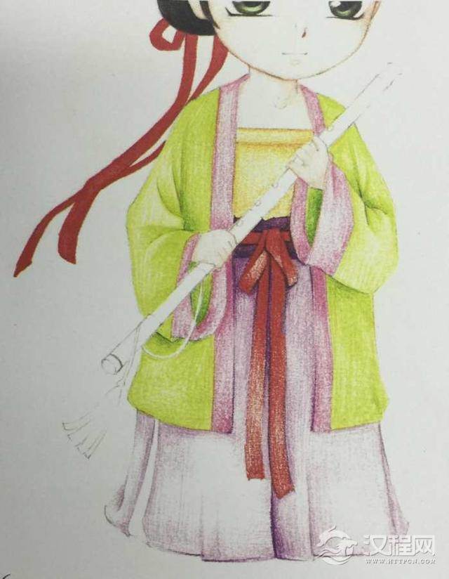 14、刻画服饰,用470黄绿为外面的褙子上色。