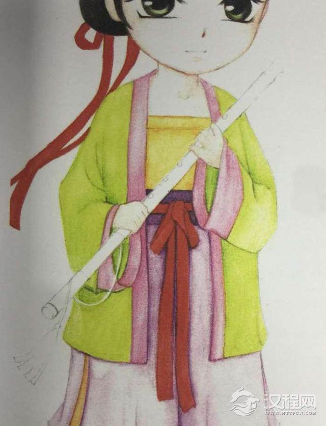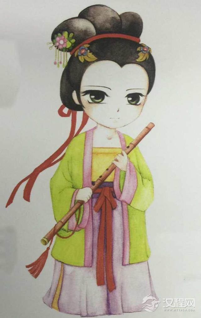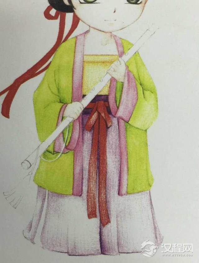 20、用清水将萧的颜色晕染开来,等水分干后,用476熟褐加深萧孔,并用418朱红画出萧上的红色吊坠。