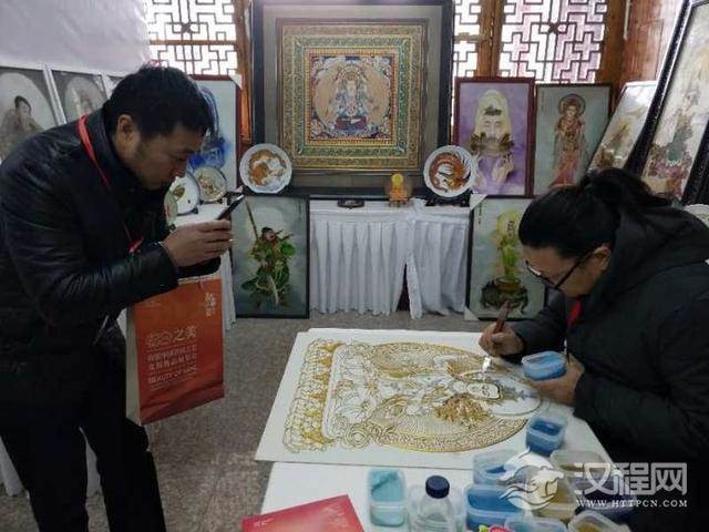 在精品展区,许多游客围着一件金光腾耀的作品议论着。这件由河北省工艺美术大师李果女士带来的作品,名曰“丹凤花灯”,作品采用的是国家级非遗——花丝镶嵌技艺,丝嵌斑斓,精巧独致。李果说,为了参加这次展览,她还专门制作了一件“寒山拾得”作品。