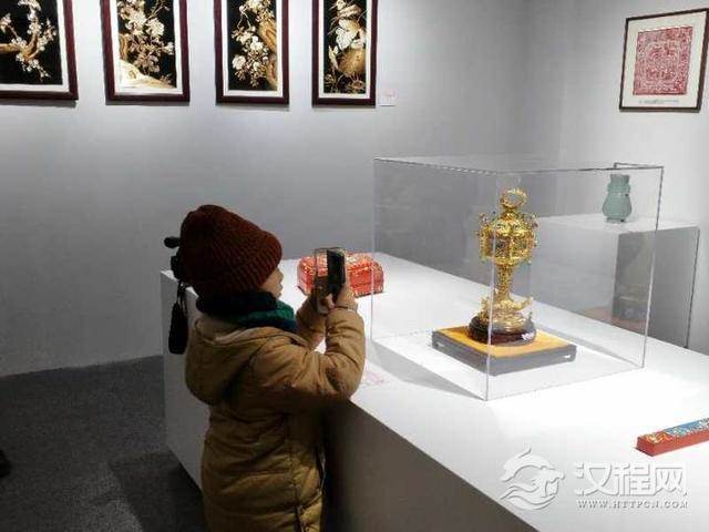 在当天的展览会,像周蒋利一样带着作品前来参加的国家级、省级工艺美术大师有130多位,展览作品涵盖了雕塑类、书画剪纸类、服装饰品类、民间陶瓷类、编制刺绣类、文房四宝类等七大种类,以蕴含和合文化元素为要件。