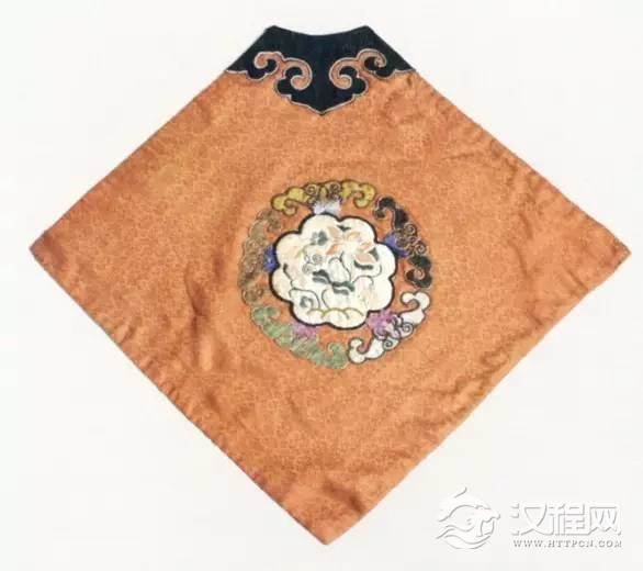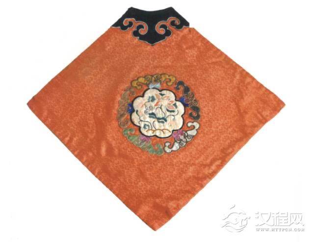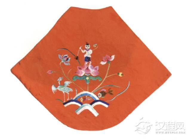 此肚兜为菱形,绣如意纹圆领,下端为尖角,橘红色地,中间贴绣五福连生贵子纹,寓意吉祥如意、连生贵子。